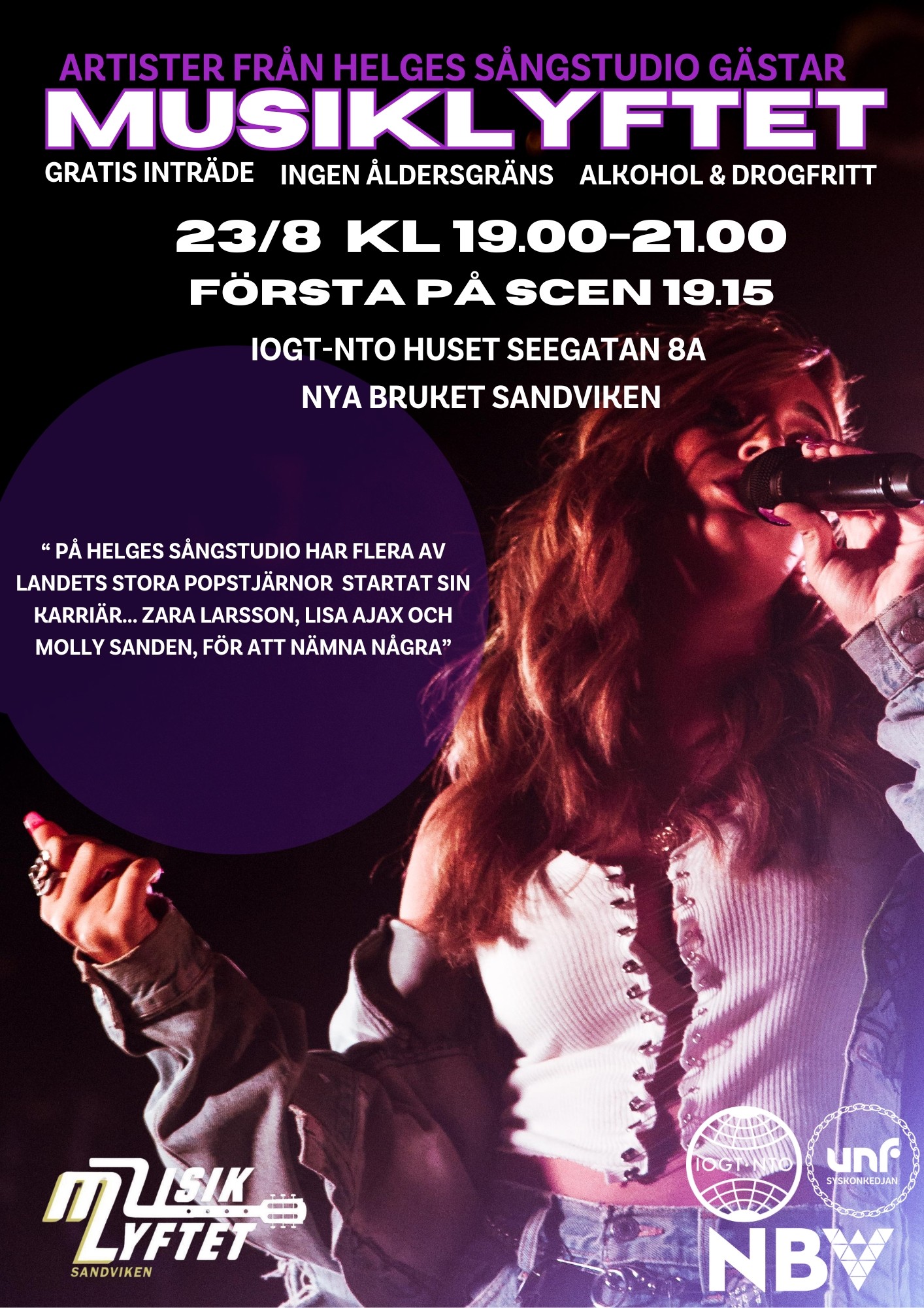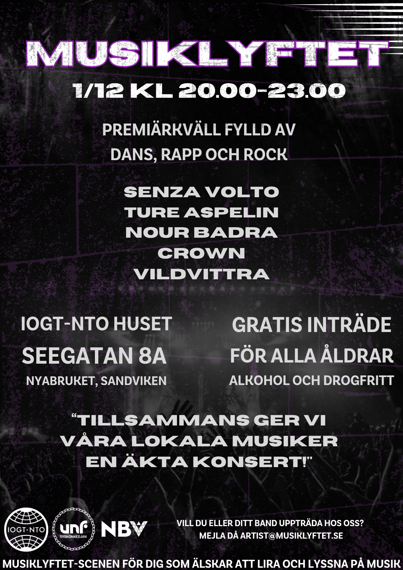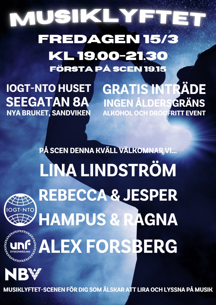 Är föreningen bakom Musiklyftet tillsammans med UNF Syskonkedjan. Vi är en nykterhetsförening och är belägen mitt på Nya Bruket i Sandviken. Alla tillställningar hos oss är helt alkohol och drogfria och alla är välkomna på våra arrangemang likt Musiklyftet.